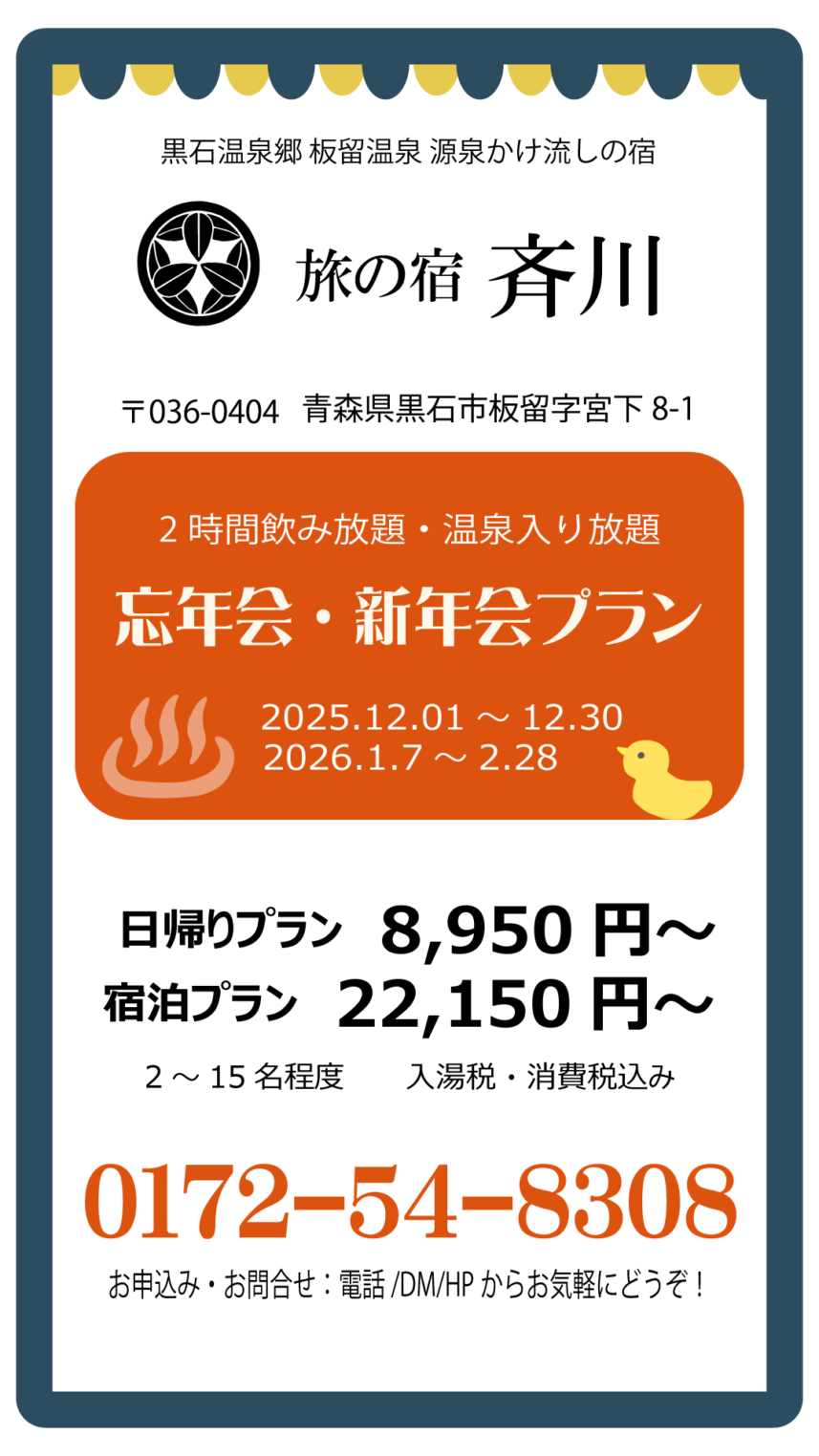 旅の宿 斉川の忘年会・新年会プラン 復活です。